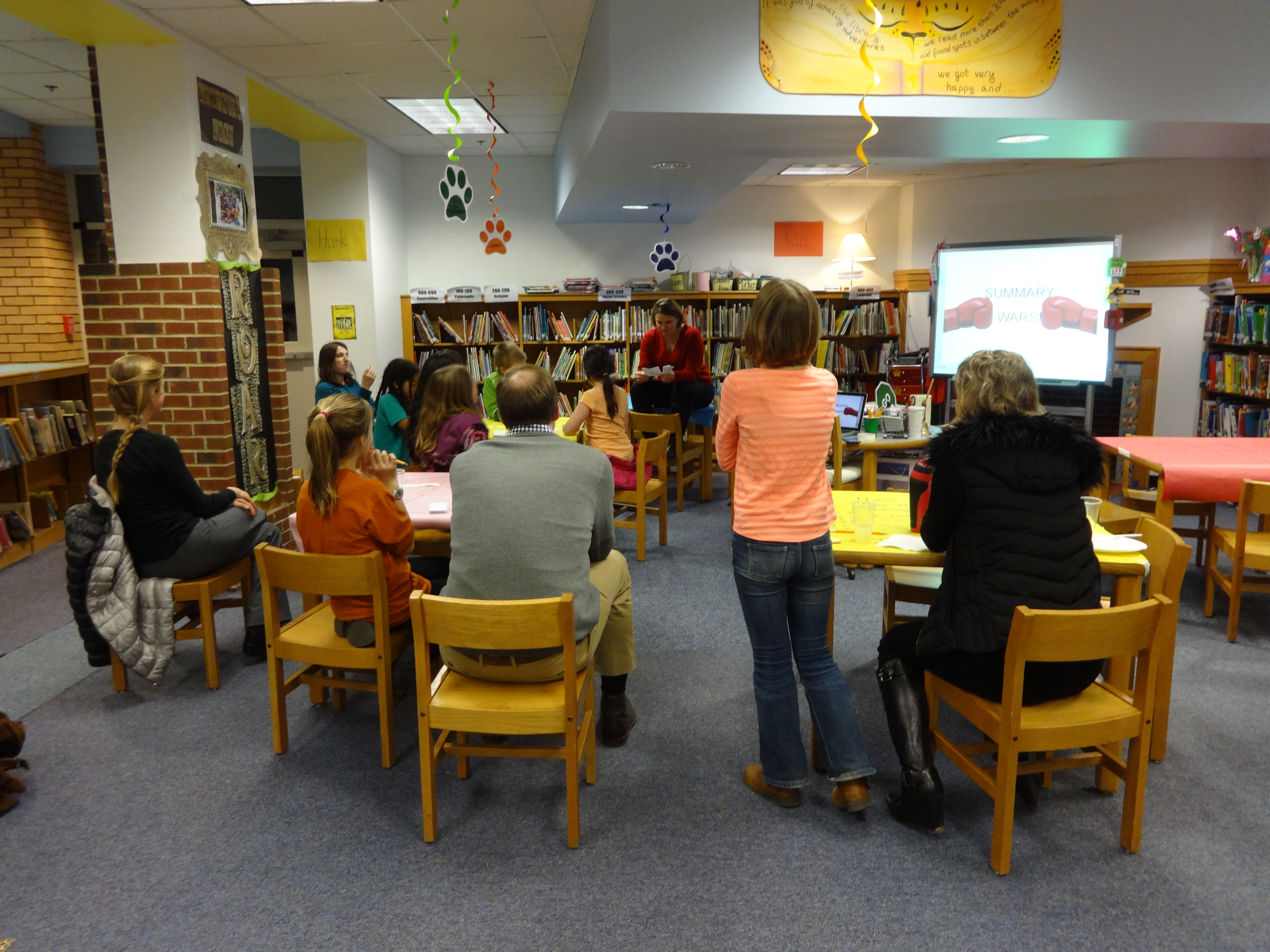 We finished the night with SUMMARY WARS, a competition that takes place frequently in Mrs. Rickabaugh’s room. There were no teams on this exercise – each reader was on his/her own! Each reader had five minutes and one piece of paper to write their best summary of Shades of Gray, the whole story! Every character, every plot twist, every detail! For some of our readers and writers, keeping the summary SHORT was the biggest challenge! Mrs. Rickabaugh read each summary out loud, and after a few votes, we realized we just couldn’t pick a winner. They were all too good!