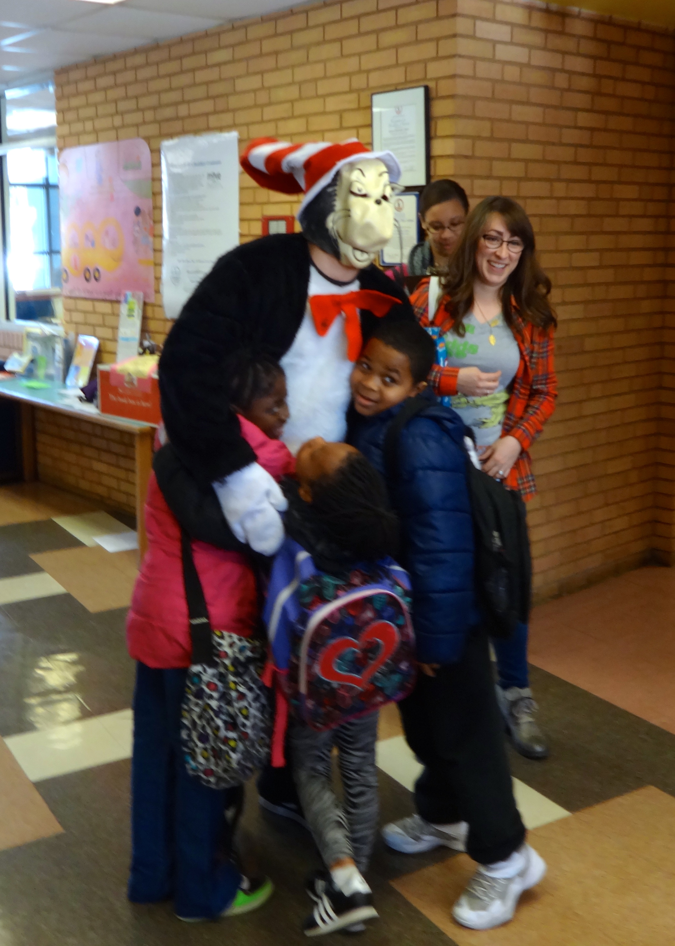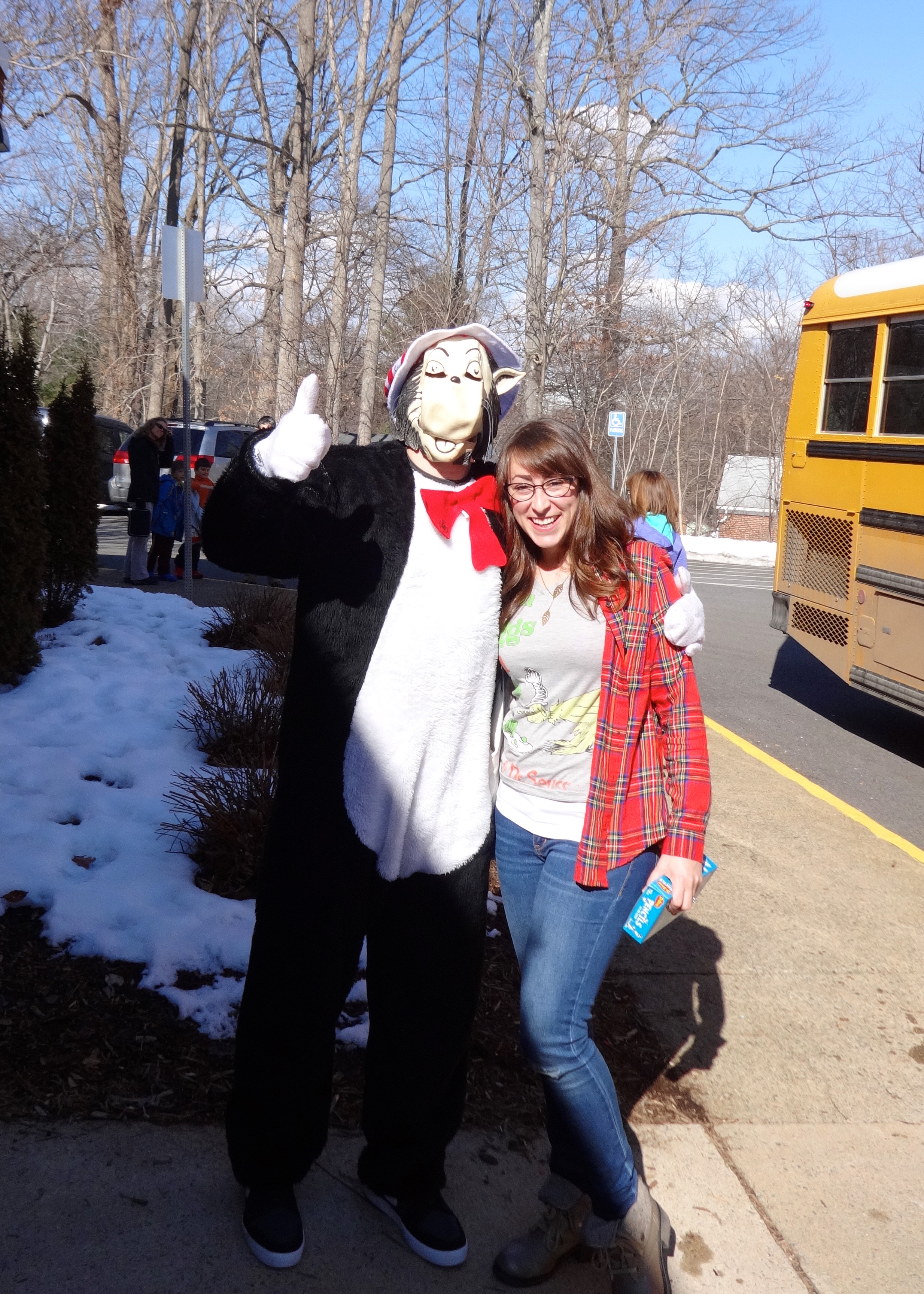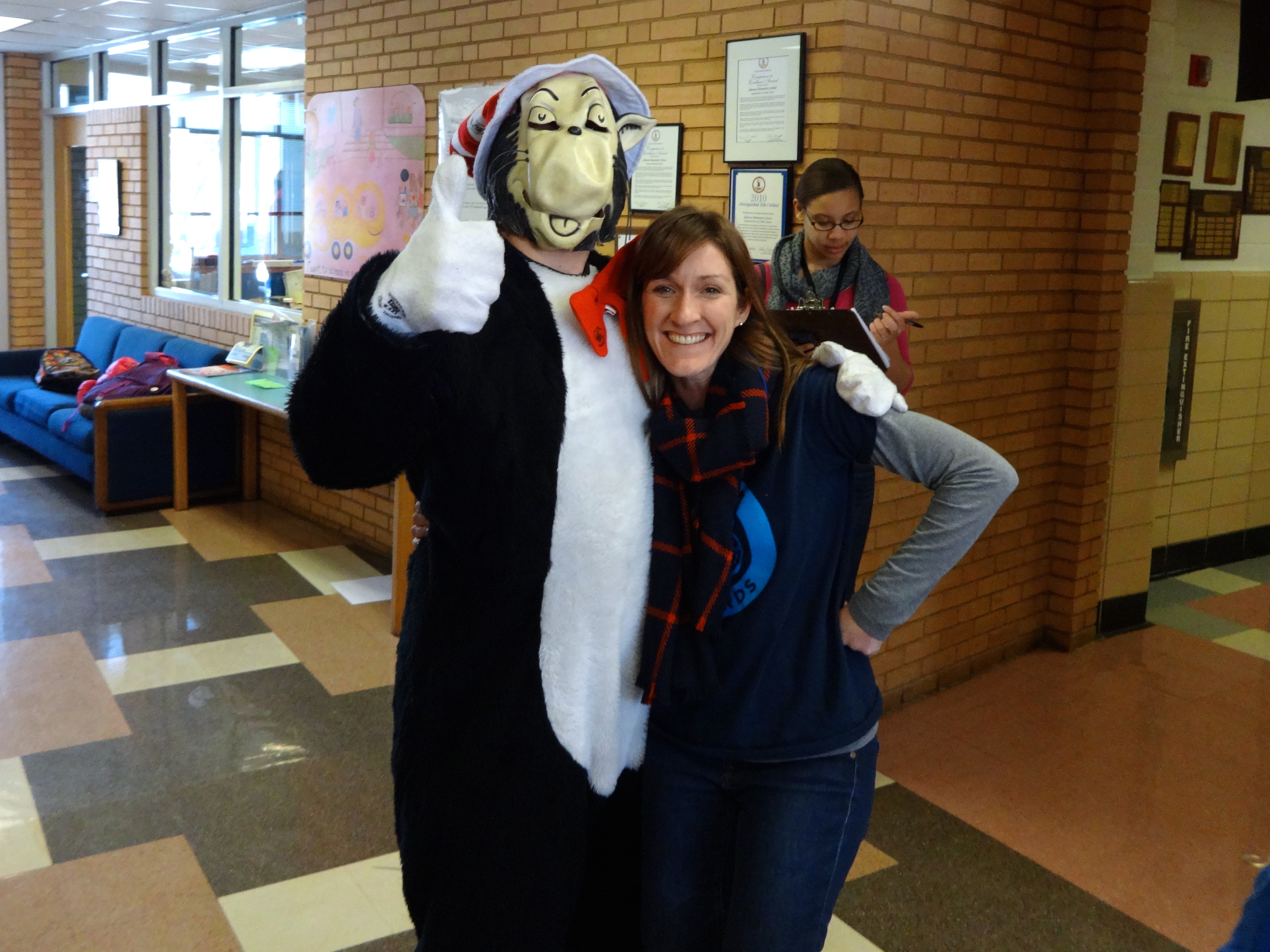 If you guessed The Cat in the Hat, you are correct! The Cat and I spent Friday afternoon touring classrooms to give students all the info about next week’s Read Across America celebration. We handed out stickers, sang some favorite songs, and even showed off some dance moves.