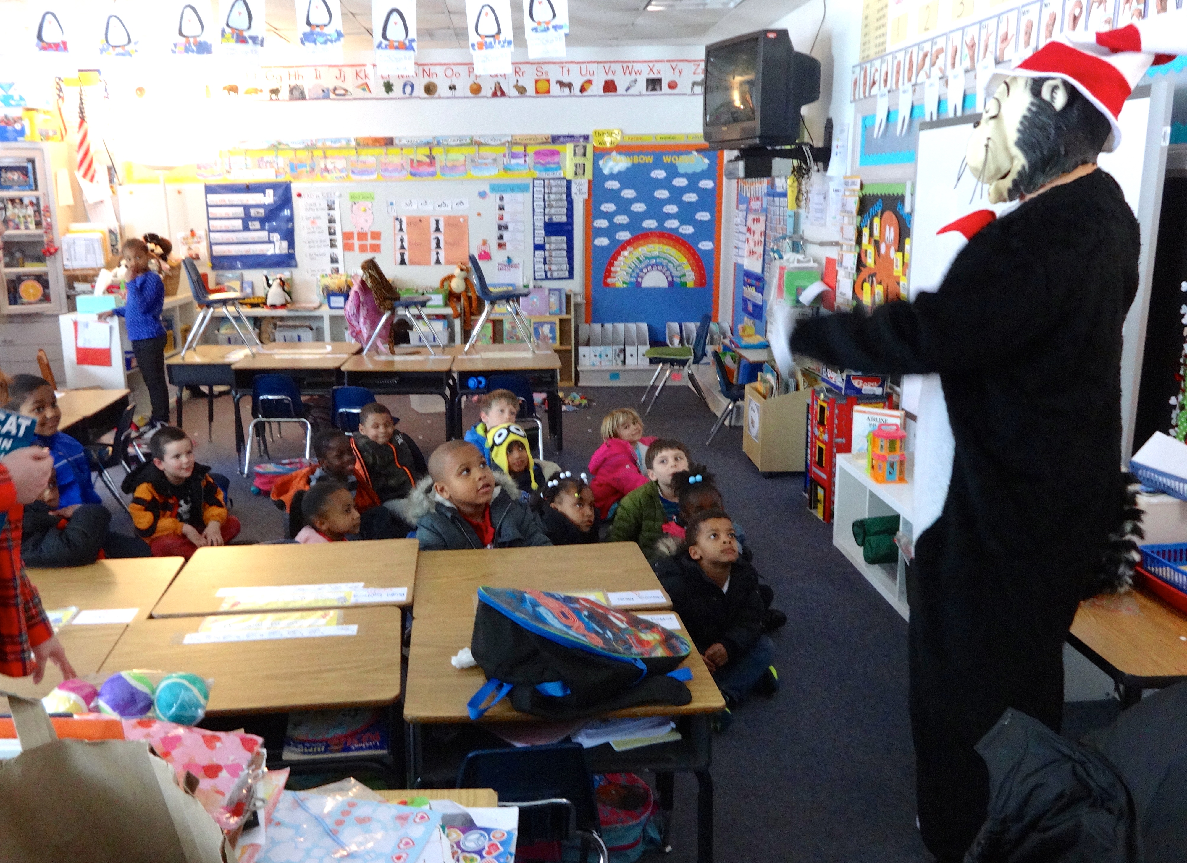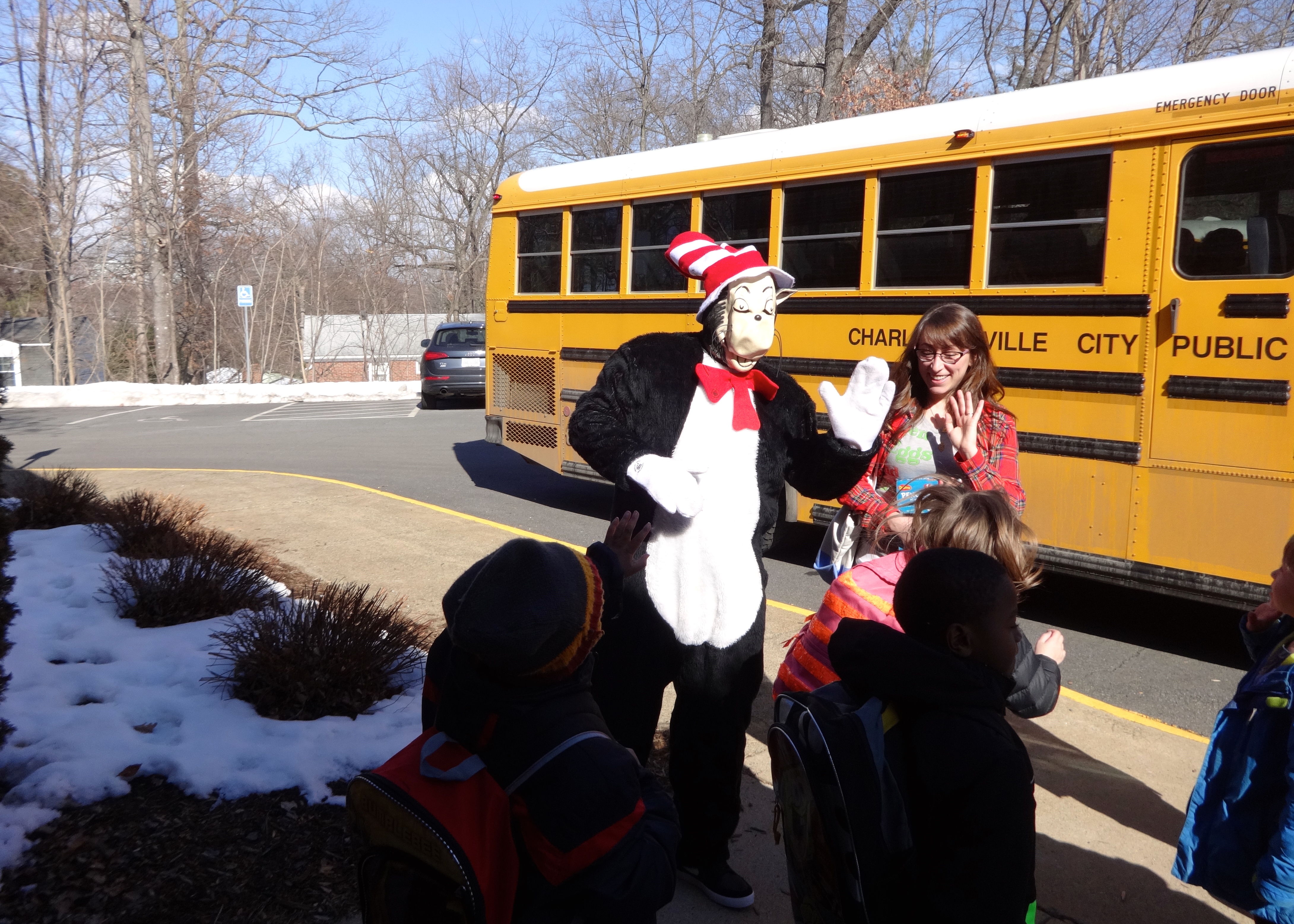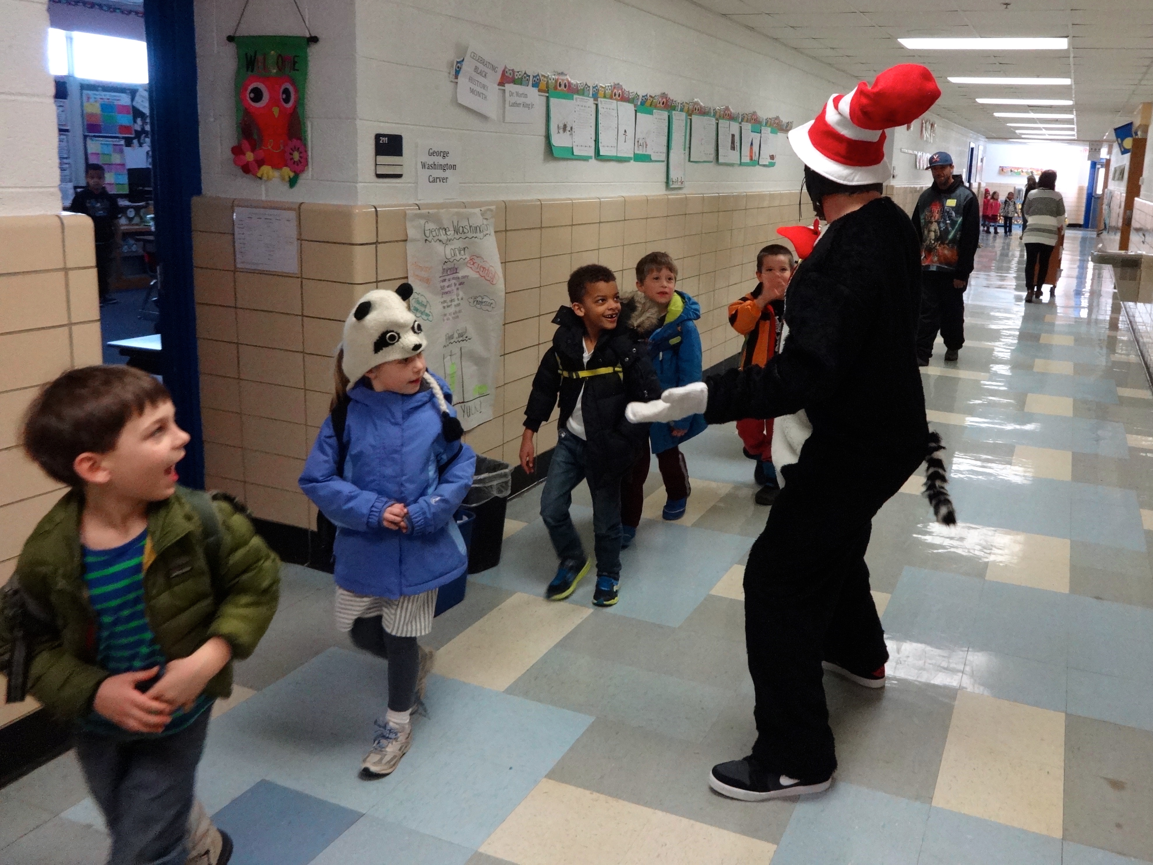 If you guessed The Cat in the Hat, you are correct! The Cat and I spent Friday afternoon touring classrooms to give students all the info about next week’s Read Across America celebration. We handed out stickers, sang some favorite songs, and even showed off some dance moves.