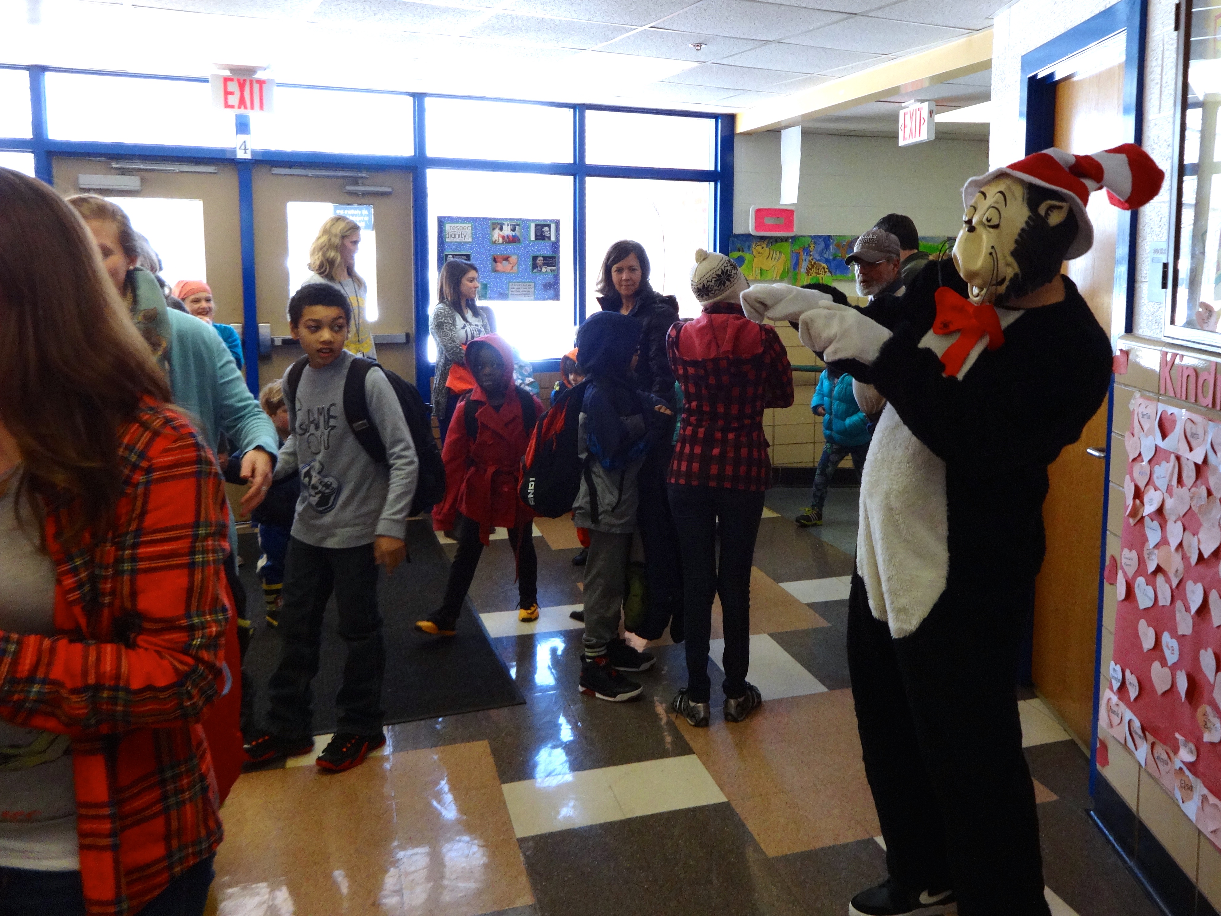 This afternoon, Johnson welcomed one of its favorite visitors. I’ll give you a hint…. this visitor is about six feet tall, and he’s not exactly human. His red bow tie matches perfectly with his black and white tail. And you can’t forget about that iconic cap on his head…