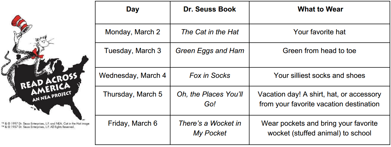 And don’t forget about our Seuss-themed SPIRIT DAYS! Show your support for literacy and all things Seuss by following this chart each morning: