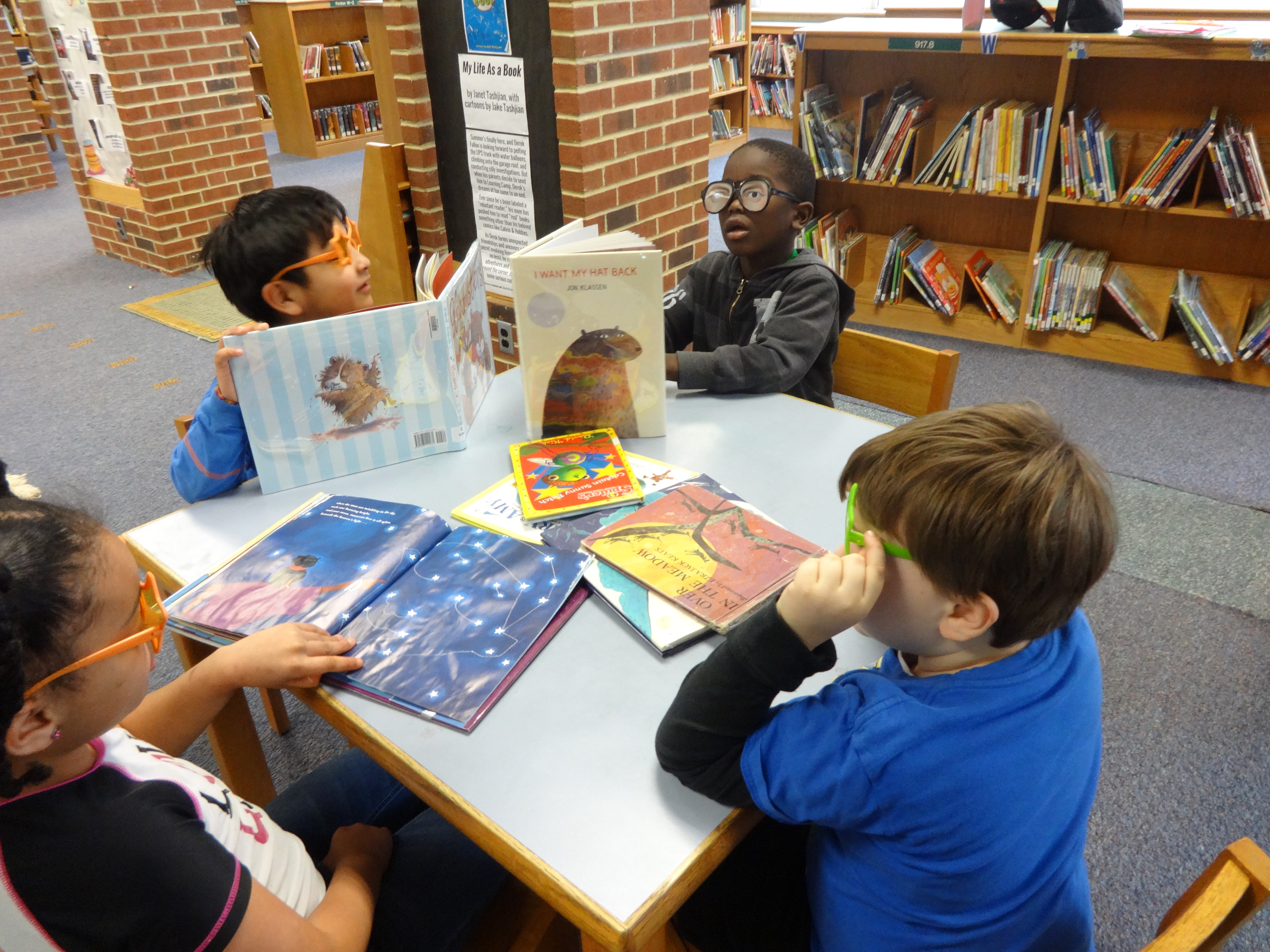 Kindergarten and first grade readers enjoy some Book Preview Time with their preview glasses before choosing just one book for checkout. I have spent this year collaborating with Johnson’s kindergarten team and instructional coach to help Johnson’s youngest patrons become stronger, more independent readers. This preview time is a great opportunity for them to flex their reading muscles and work on their stamina! Plus, it’s extra fun to read while you’re stylin’ in sunglasses 🙂