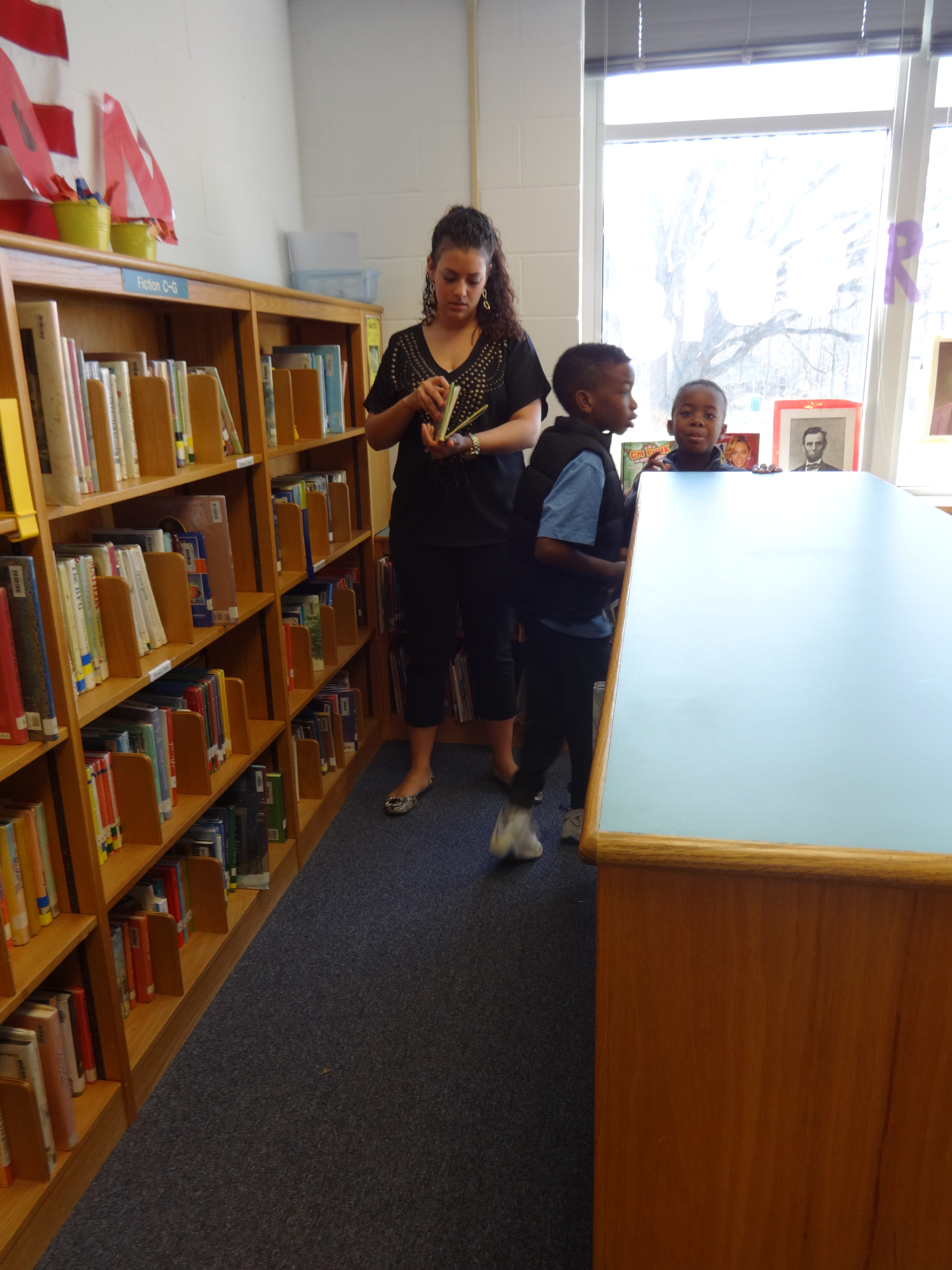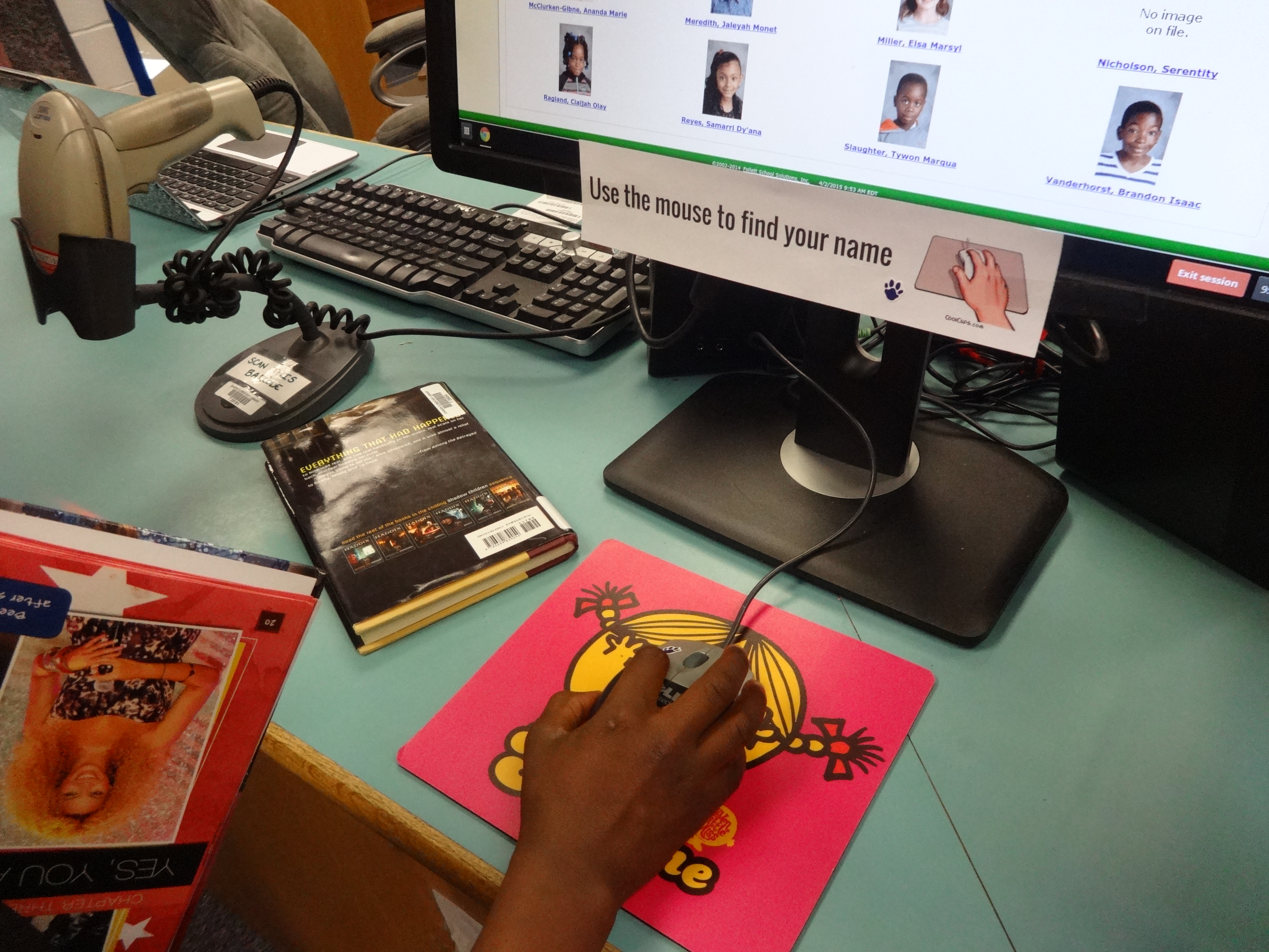 A second grade class searches for the perfect books to check out with Mrs. Covington during their checkout time. In the last two pictures, two role model students show off some of the changes with our new computer system. Our old checkout computer was a touch screen, but our new computer offers faster and more reliable checkout for students. It has been a challenge for some students to get used to using a mouse – above, Thimson and Brandon show the steps for a successful checkout, including clicking the pawprint on the mouse and listening for the happy noise after you scan your book. Thanks for the help, guys!
