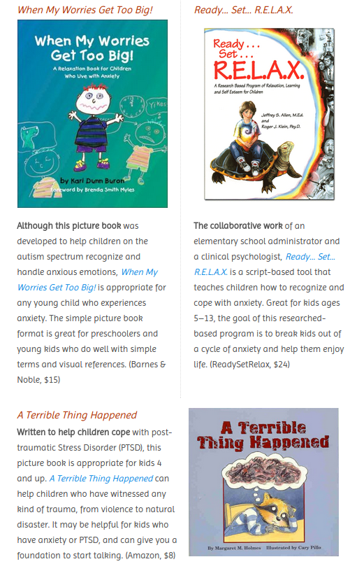 AllParenting.com states that “an estimated 3 percent of children between the ages of 3 and 17 have anxiety. On top of that, any child may experience anxiety associated with certain situations or fears. These six books can help your child deal with anxiety and learn to cope.” Click the photo below to see their top resources for helping children deal with anxiety.