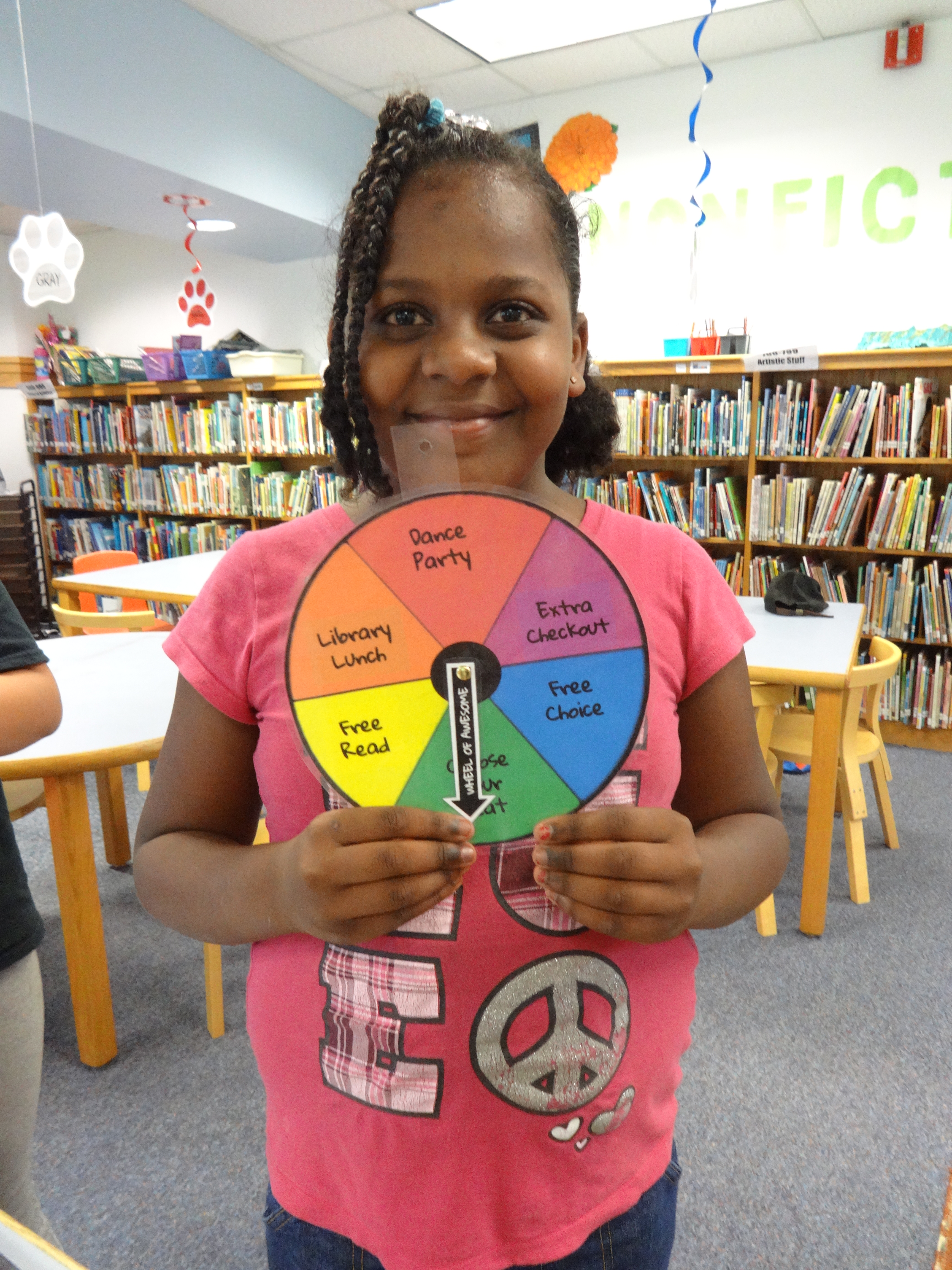 The Golden Shelf Award may be infamous, but it’s not the only prize students can earn with stellar library behavior. With each lamp earned, classes get a stick on the Learning Leopard Library Lamp Leaderboard chart. Three stickers in a row earns a spin on the Wheel of Awesome – with each spin, students can win prizes like bonus checkout time, a week free of teacher assigned seats, a dance party, or a VIP library lunch!