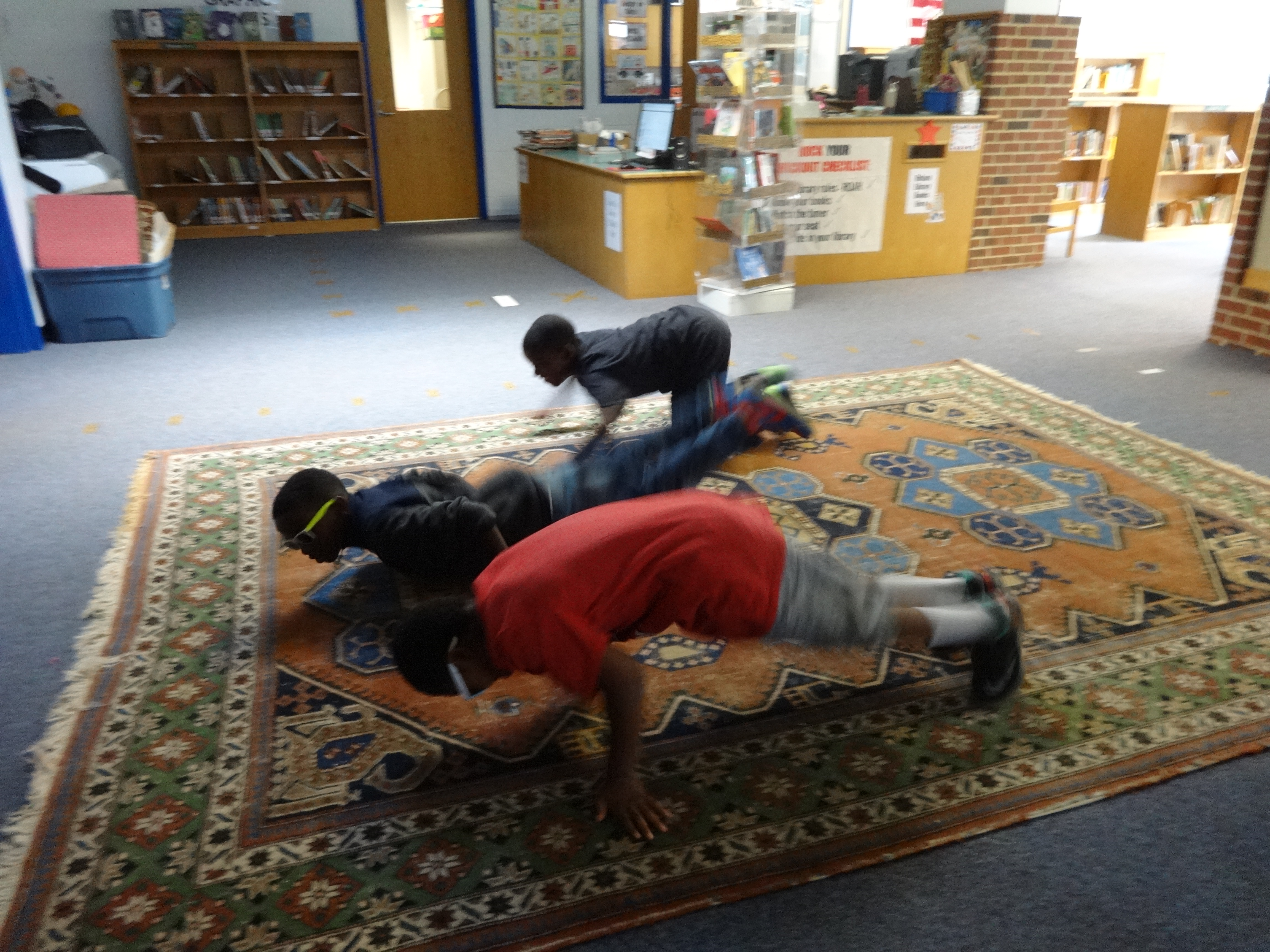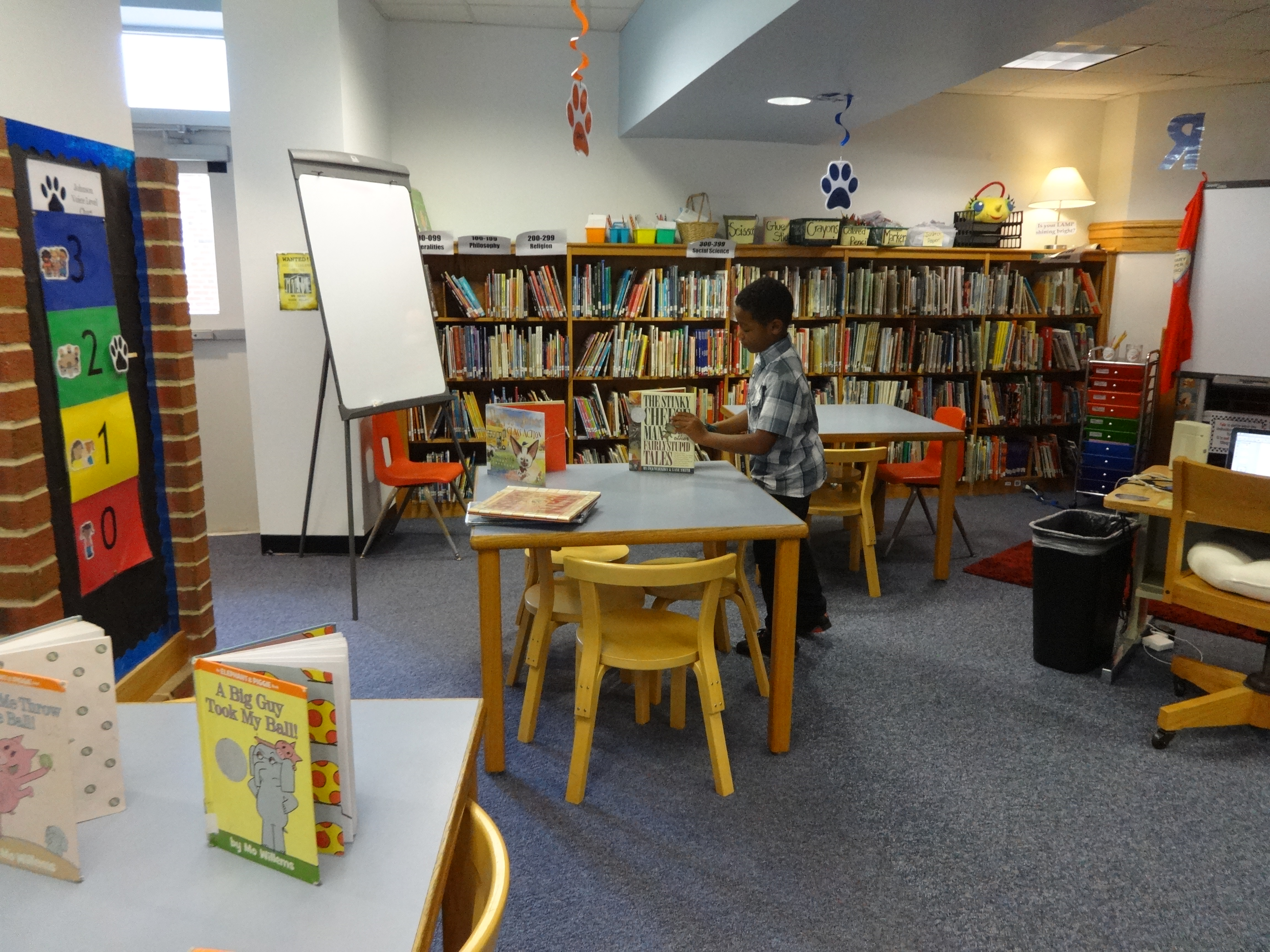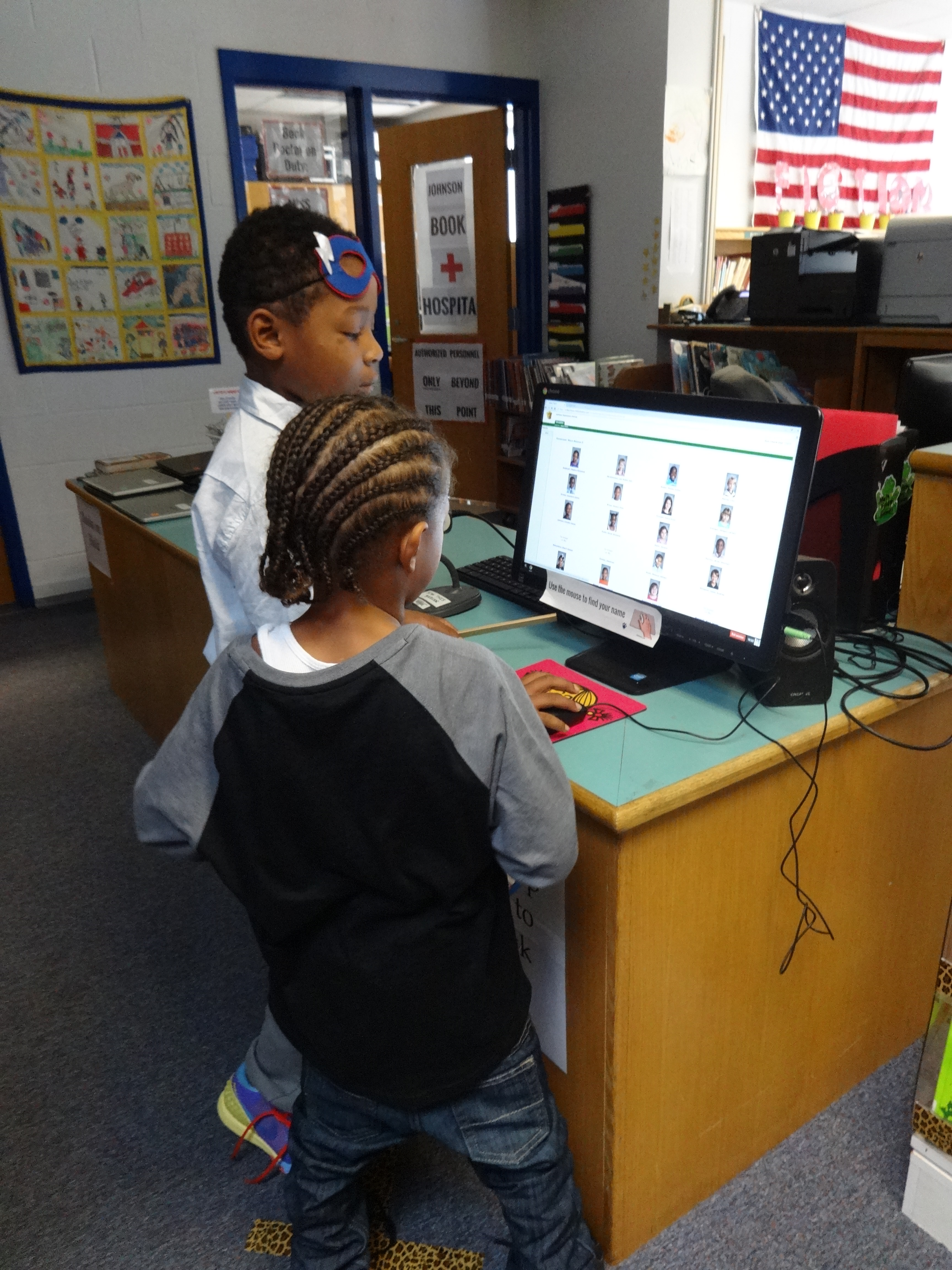 Second graders continued their Library Superhero training this week. Being a hero is physically and mentally draining business, but Johnson second graders are up to the challenge. Each week, I see these students moving leaps and bounds toward independently navigating the library, using the checkout system, and becoming more confident library users. As I move around the library with my Library Superhero cape trailing behind me (yes, I have a real cape – don’t you?), one lucky student each day runs the computer and assists their classmates as my superhero sidekick. In the photos above, Kyheim fulfills his sidekick duties with ease and grace, running the checkout computer, helping classmates find books, and choosing checkout selection for kindergarten and first graders.
